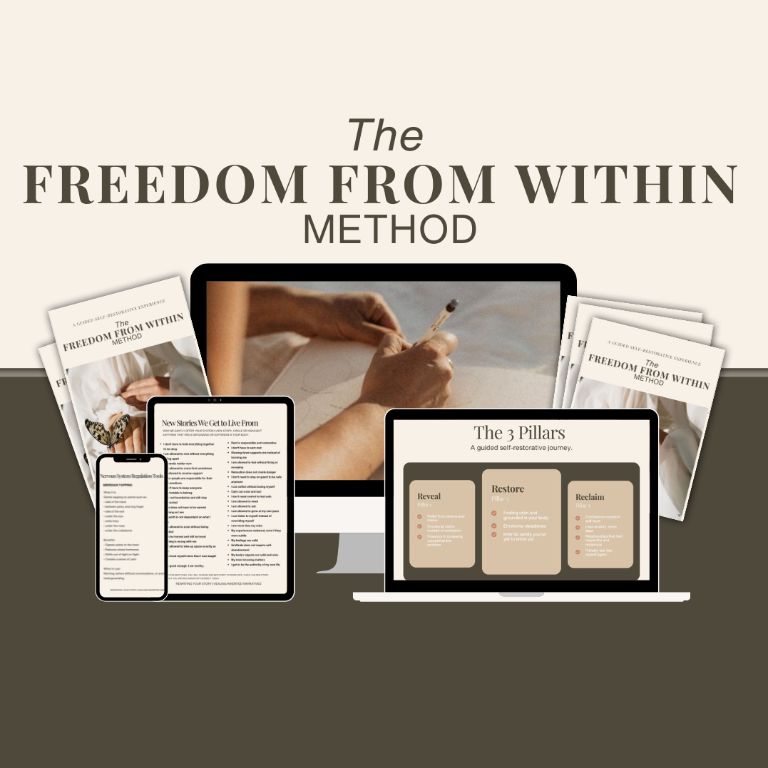 Imagine: A guided restorative journey to untangle early relational wounds, restore nervous system safety, and return to the woman you were before survival mode shaped you. The Freedom From Within⢠Method is designed to give you exactly what you need at a pace that matches your current season, without causing further depletion or stress. Â